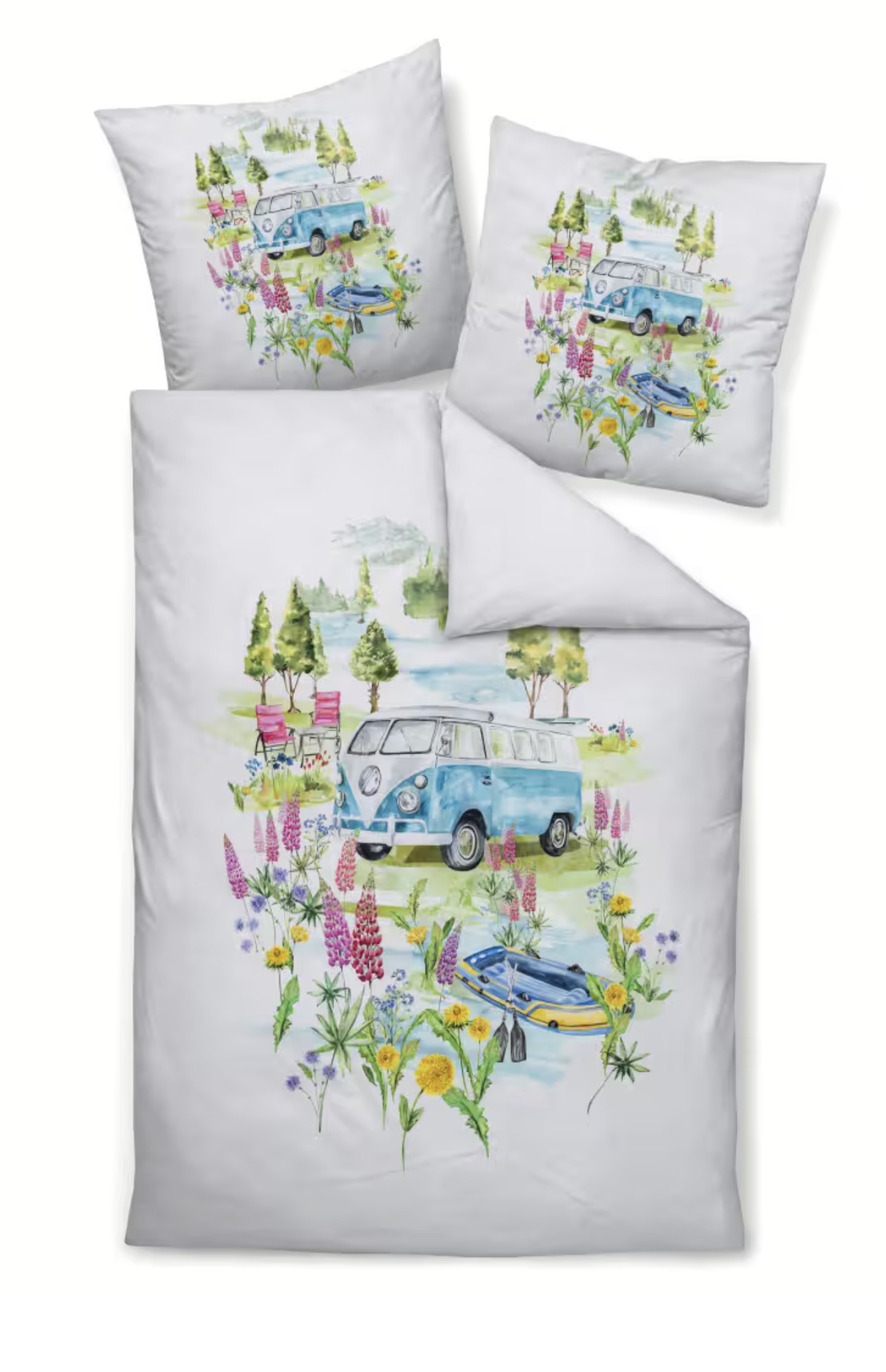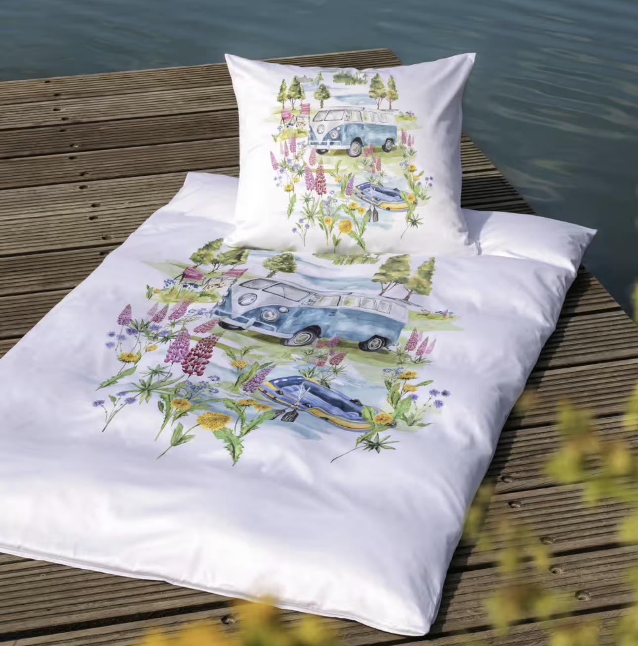 Auf strahlend weißem Fond steht ein ikonischer blauer VW-Bus im Mittelpunkt – umgeben von farbenprächtigen Blumen, die pure Sommerenergie ausstrahlen. Liebevolle Details wie Campingstühle und ein Schlauchboot erzählen von Roadtrips, Naturverbundenheit und entspannten Momenten unter freiem Himmel. Dieses Design weckt Erinnerungen – und schafft neue.